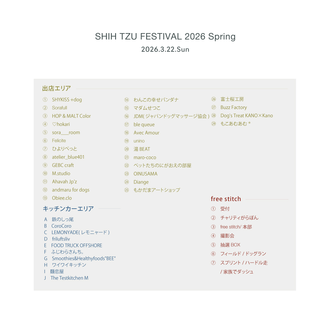 Shih Tzu Festival 2026 Springでは、皆さまが1日を通してお楽しみいただけるショッピングエリアをご用意しております。 いただいたコメントと共に出店者をご紹介いたしますので事前にチェックしてくださいね。 ※随時更新していきます